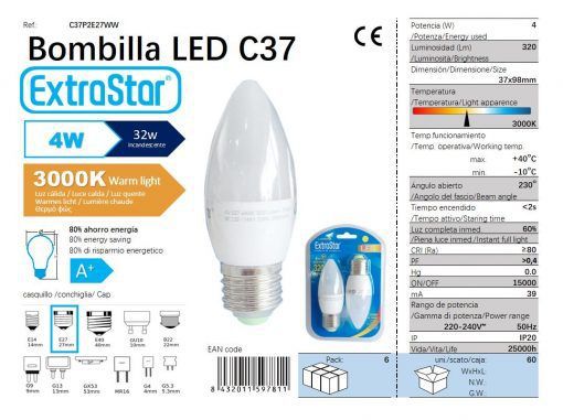 LÂMPADA VELA LED SET 2X4W E27 3000K LUZ QUENTE LED 4W